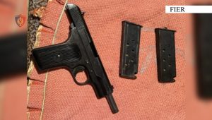 Gjatë kontrollit të banesës, shërbimet e Policisë gjetën dhe sekuestruan 1 armë zjarri pistoletë, 2 krehëra dhe 14 fishekë luftarak.